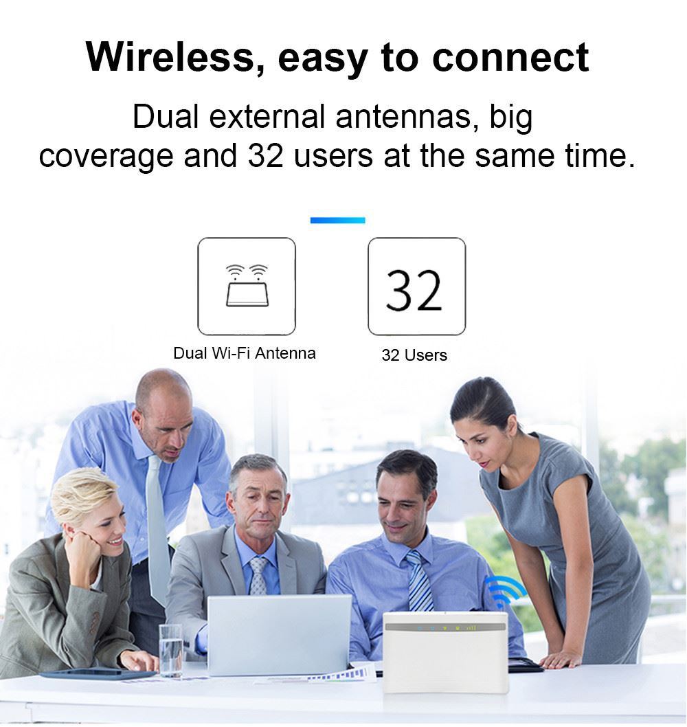 Acesta este un router CPE interior LTE foarte avansat. Este conceput pentru a satisface nevoile de date integrate și de acces Wi - Fi pentru utilizatorii rezidențiali, de afaceri și întreprinderi. (se poate conecta la antene externe cu conector SMA!) 150M de mare viteză, LTE FDD: DL/UL 150M/ 50 Mbps (Cat 4). Transferați 4G la Wi - Fi, nu este nevoie de acces în bandă largă, introduceți o cartelă SIM, plug and play. WiFi Acoperă întregul apartament și casa, bucurați-vă de internet de mare viteză peste tot. Ușor de conectat, antene externe duble, acoperire mare și 32 de utilizatori în același timp.